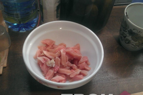 Nous avons donc coupé le poulet bouilli et fumé en tranches de 0,5 cm.