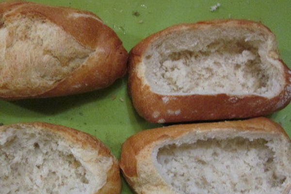 Nous coupons les petits pains en 2 parties: 2/3 et 1/3, retirons la chair de la plus grande moitié.