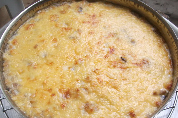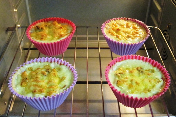 Mettez les moules dans le moule, râpez le fromage à l'étage et mettez au four 25 minutes.