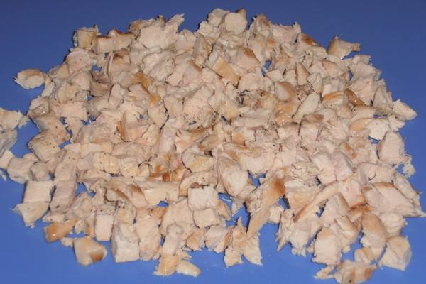 Faire bouillir la poitrine dans de l'eau salée, refroidir et couper en petits morceaux.