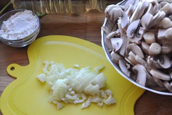 Hachez les champignons avec les oignons et faites les cuire à la poêle pendant 15 minutes.
