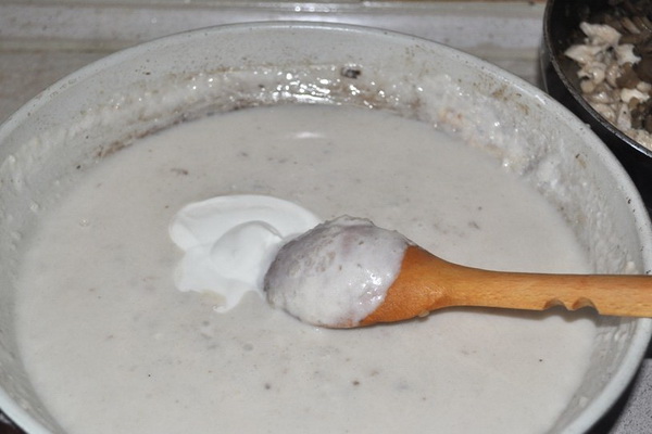Ajouter le sel, le poivre blanc et la crème sure, laisser mijoter à feu moyen pendant 10-15 minutes.