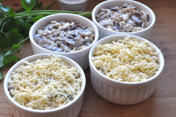 La viande de poulet juteuse, l’arôme des champignons de la forêt, le tout dans une sauce crémeuse douce et sous une épaisse couche de fromage fondu. La cuisson de la julienne faite maison avec du poulet et des champignons avec de la crème n'est pas difficile.