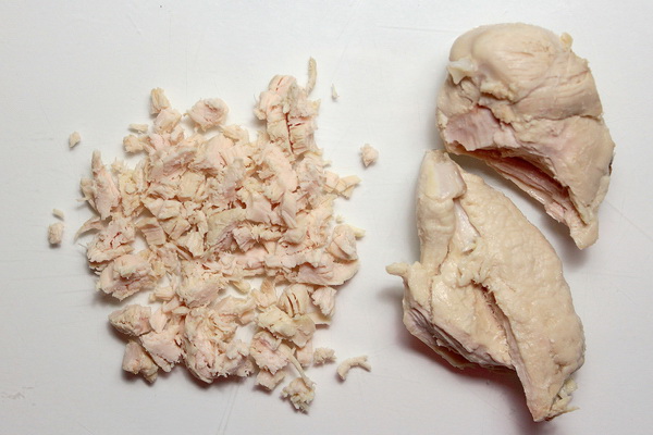 Faire bouillir la viande, laisser refroidir et couper en nouilles minces.