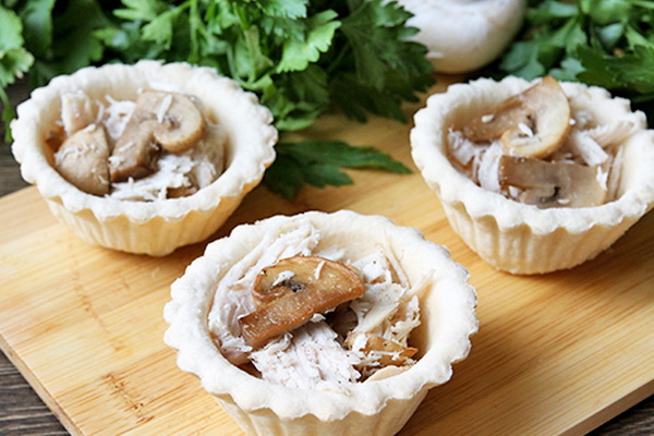 Abaisser la pâte en une fine couche, découper en rectangles de 8x10 cm, former des paniers et garnir de champignons et de poulet.