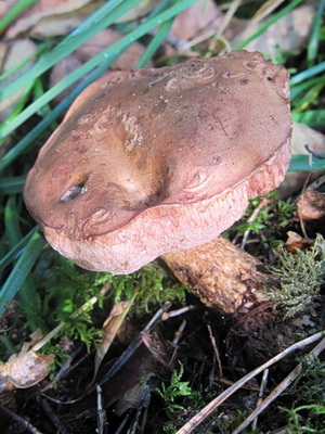 Chapeau de champignon biliaire (Tylopilus felleus) (diamètre 5-15 cm): couleur coussin, marron, marron, jaune et marron. Il est velouté au toucher avec une petite peluche et sec. Après la pluie et dans un environnement humide, il devient un peu collant.
