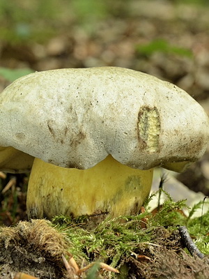 Jambe (hauteur 6-14 cm): généralement jaune ou citron, moins souvent avec une teinte verdâtre ou olive. Il a une forme cylindrique, recouverte d'un maillage fin et léger. La base du champignon ressemble à un petit tubercule.