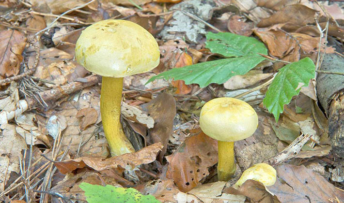 Jambe: La hauteur varie de 3 à 12 cm et l'épaisseur de 0,5 à 2 cm.Elle a parfois un épaississement dans la partie supérieure ou vice-versa - amincissement. La couleur des jambes sous les chapeaux est jaune vif et devient jaune soufre de bas en bas. À un âge plus avancé, des fibres monochromatiques ou foncées longitudinales sont visibles à la surface. Les pattes des vieux spécimens sont courbes et parfois densément couvertes d'écailles brunes.