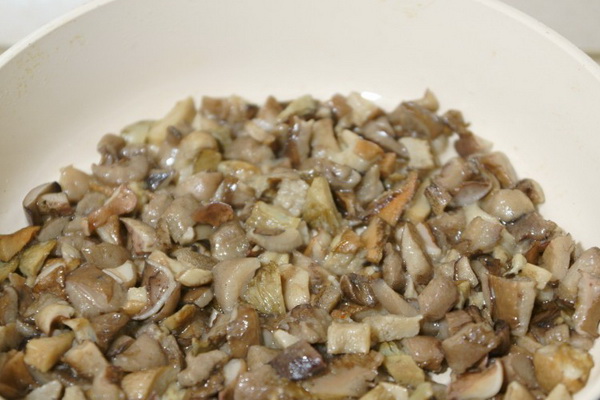 Couper les champignons bouillis en morceaux et les mettre dans une casserole sèche.