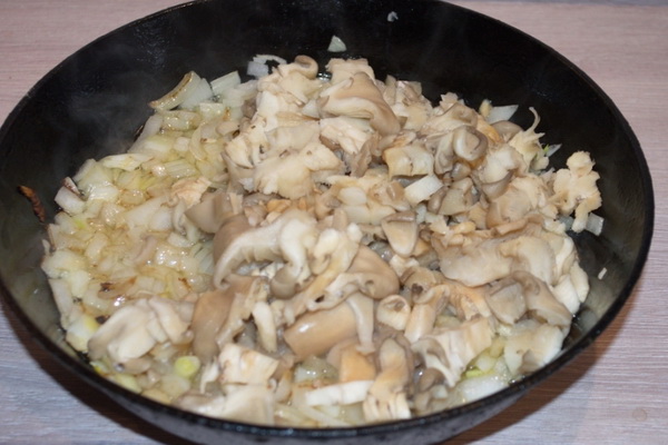 Faites chauffer une poêle avec de l'huile végétale, mettez les oignons et les pleurotes hachés, faites les frire pendant 15-20 minutes.