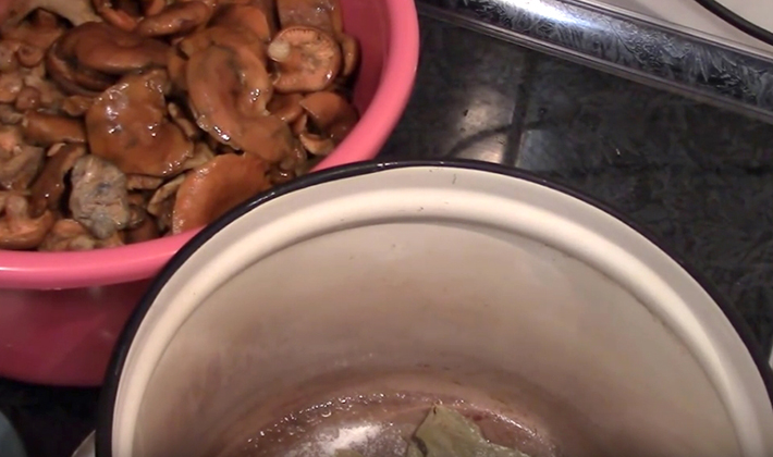 - Après le nettoyage, les champignons sont lavés à l'eau et, après égouttage, sont répartis en couches sur un «oreiller» de feuilles de raifort. Pour le salage, tout récipient non métallique est pris: verre, céramique, émaillé, bois, etc.