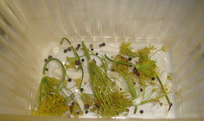 - Saupoudrer chaque couche de sel et de toutes les épices - poivre, laurier, aneth séché et clou de girofle.