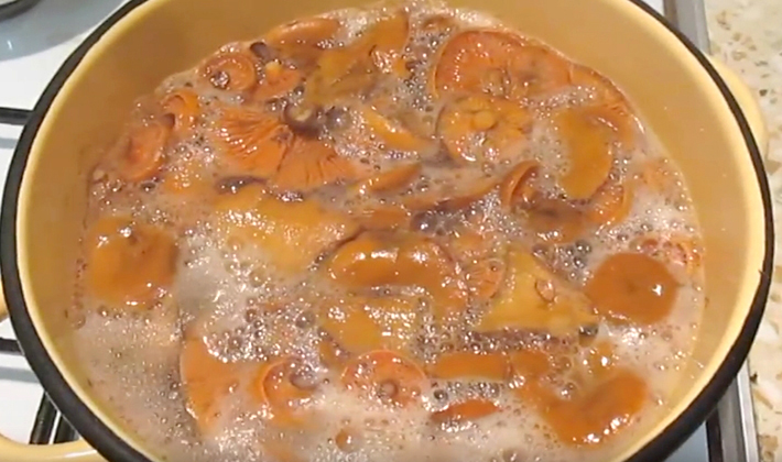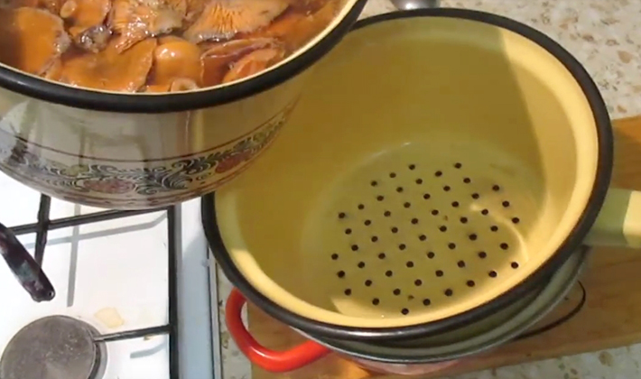 - Après 2-3 heures, nous mettons les champignons dans une passoire et les abaissons dans de l'eau bouillante pour les faire blanchir pendant 3-4 minutes.