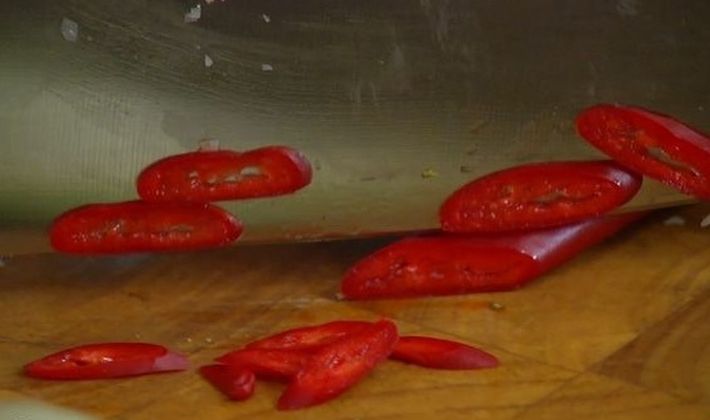 Couper le piment en morceaux, après avoir enlevé toutes les graines.