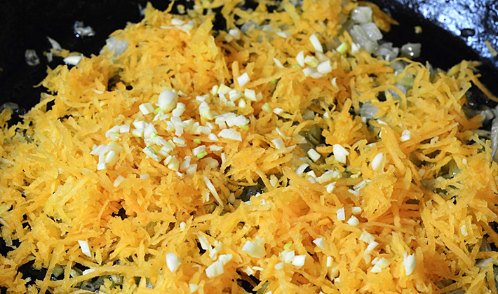 - Peler les carottes, laver, frotter sur une râpe et ajouter à l'oignon, faire revenir pendant 10 minutes à feu moyen.