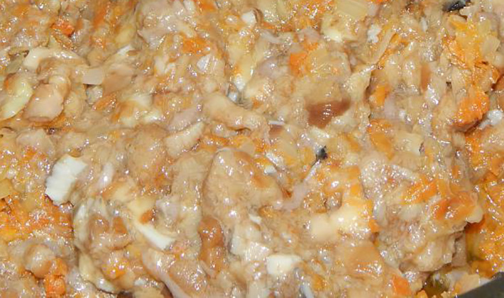 - Passer dans un hachoir à viande, mélanger avec du sel, du sucre et des champignons.
