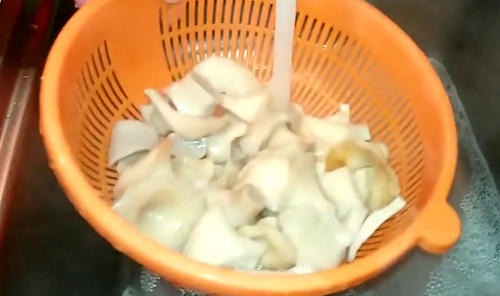 - Après un trempage prolongé (4 jours), les champignons sont bien lavés et laissés à égoutter un peu.