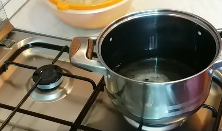 La marinade est préparée: le sel et le sucre sont dissous dans de l’eau, portés à ébullition.
