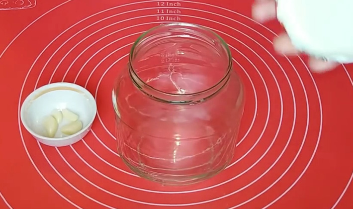 - Versez le vinaigre, versez l'ail en dés, les gousses, un mélange de poivrons et mélangez.