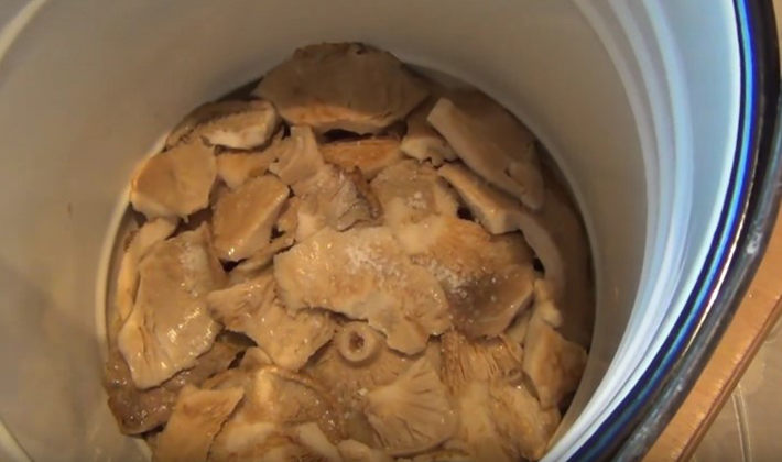 Les champignons propres et lavés sont bouillis dans de l'eau légèrement salée. Le temps de cuisson dépend du type de champignon. Cool dans l'eau froide. Sur le tamis, ils ont laissé l'eau s'écouler. Ensuite, les champignons sont placés dans un tonneau mélangé avec du sel, recouvert d'un drap et d'un couvercle oppressant. Après quelques jours, les champignons se déposent et vous devez ajouter plus de champignons avec la quantité de sel appropriée.