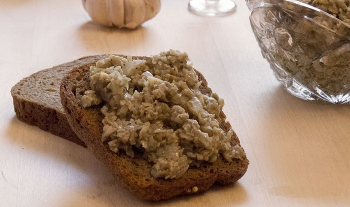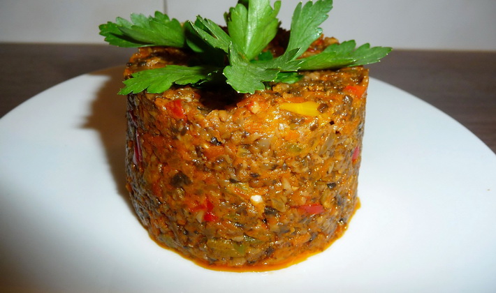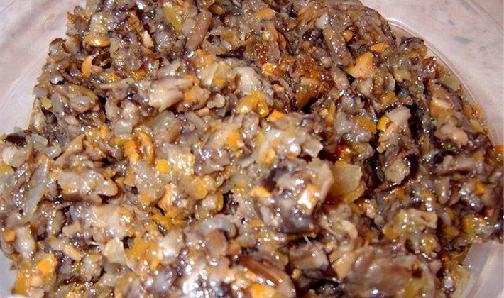 - Broyez-le avec un hachoir à viande, ajoutez-le aux champignons, ajoutez des herbes hachées, du paprika, un mélange de poivrons moulus et ajoutez-les au goût.