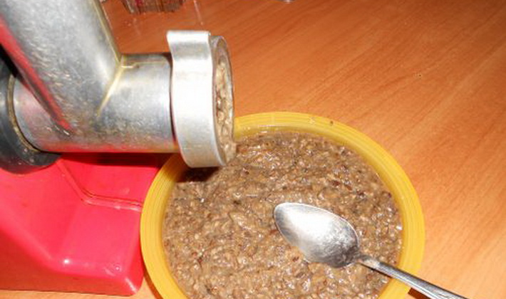 Nous tordons les champignons dans un hachoir à viande 2 fois pour obtenir un grain fin.