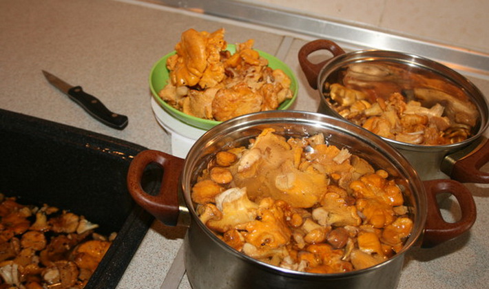 - Les girolles sont nettoyées, lavées et bouillies pendant 20 minutes dans de l'eau salée, avec l'ajout de clous de girofle, de feuilles de laurier et de piments fort.