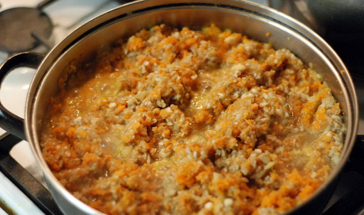 - Bien mélanger, laisser mijoter à feu doux pendant 50 minutes, remuer constamment, en ne laissant pas la masse brûler.