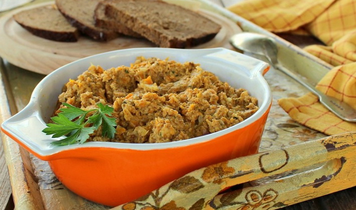- Combiner tous les ingrédients frits et les champignons bouillis, laisser refroidir et broyer la masse entière dans une purée de pommes de terre à l'aide d'un mélangeur à immersion.
