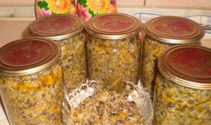 En outre, les recettes de caviar de champignons, préparées pour l’hiver à partir de girolles, comprennent toutes sortes d’épices et d’épices: marjolaine, poivre, paprika, clou de girofle, laurier, etc.