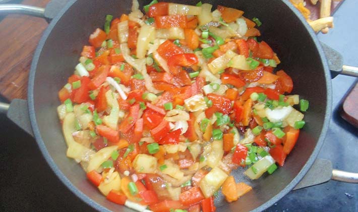 Couper les champignons cuits avec les légumes en tranches et les mélanger avec les tomates hachées.
