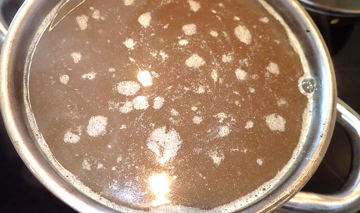 Filtrer le bouillon de champignons, ajouter le sel et le sucre, chauffer à ébullition et laisser bouillir, en règle générale, presque la moitié.