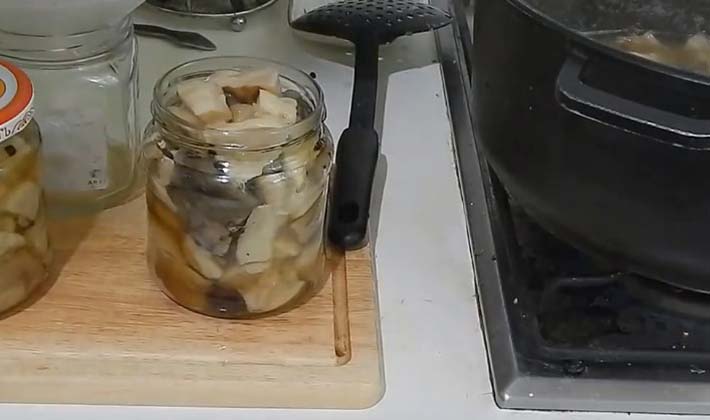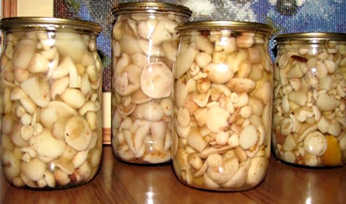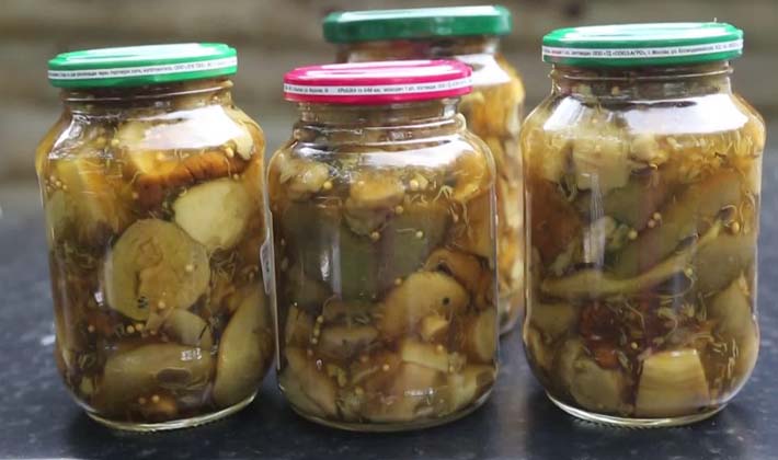 Les champignons préparés sont blanchis, puis cuits dans une casserole pendant environ 30 minutes, avec l’ajout d’huile et de sel. Lorsque les champignons donnent du jus, la trempe est arrêtée. À chaud, ils sont disposés dans des bocaux en verre préparés, martelés avec la sauce dans laquelle ils ont été cuits et stérilisés, comme dans le cas de la conservation des champignons, puis enroulés.