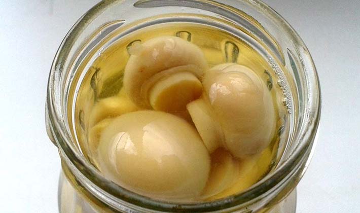 - Dans chaque bocal, versez un cinquième du volume d’eau bouillie avec un peu de vinaigre (3 cuillerées à thé de 5% de vinaigre pour 100 g d’eau), remplissez de champignons et stérilisez.