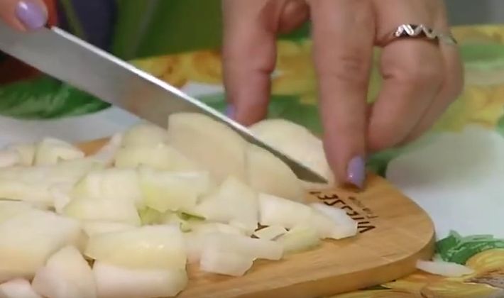 - Nous nettoyons les oignons, les lavons sous le robinet et les broyons en cubes.