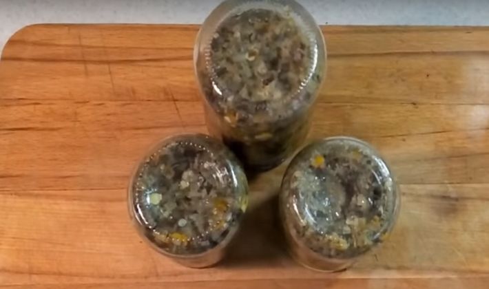 - Nous déposons dans des bocaux stérilisés, versons de l’huile chaude sur le dessus et fermons avec des housses en nylon bien serrées.