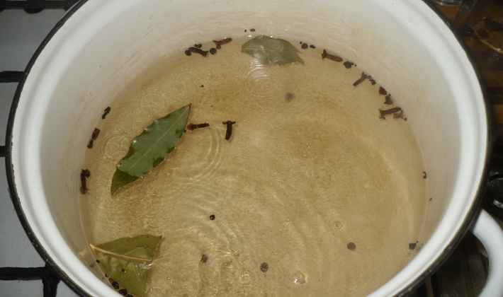 Dans une casserole avec de l'eau, nous combinons le sel, le sucre, le laurier, le clou de girofle et le poivre.