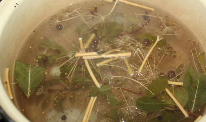 - Chaque couche de fructification doit être saupoudrée de sel, d’ail, d’aneth, de laurier et de poivre noir.