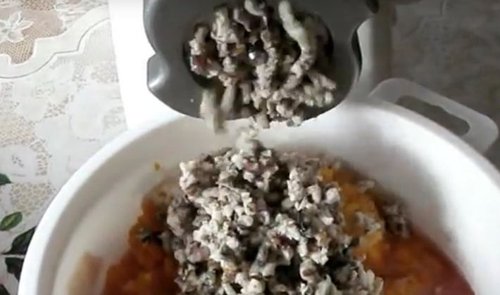 - Moulez dans un hachoir à viande (1 ou 2 fois) et placez-le dans une casserole, un plat ou une casserole séparée.