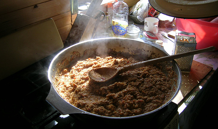 - La masse obtenue est cuite à feu doux pendant 20-25 minutes, après quoi on ajoute du poivre, du vinaigre et du sel.