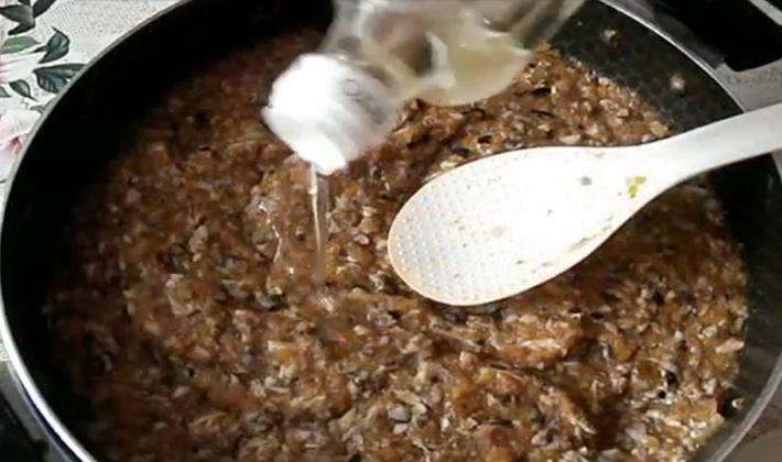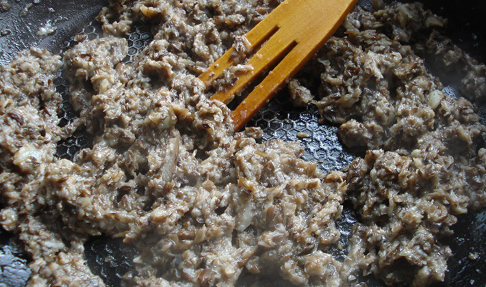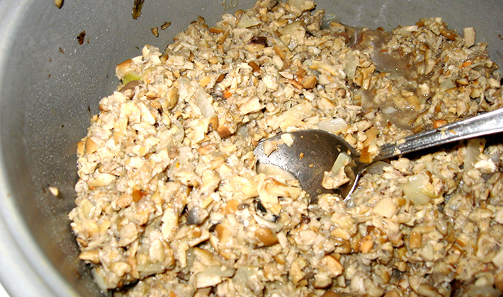 - Dans un moulin à viande, moudre les champignons trempés et bouillis et les mettre dans un plat à ragoût. Un mélangeur permet également de moudre le produit en viande hachée.