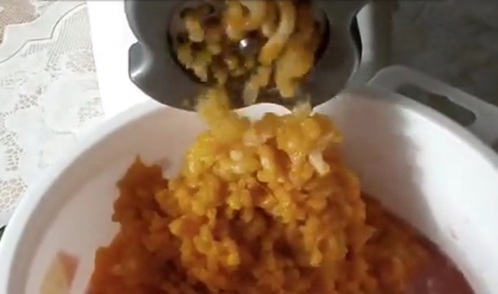 - Passer dans un hachoir à viande et mettre dans un récipient approprié pour la cuisson.