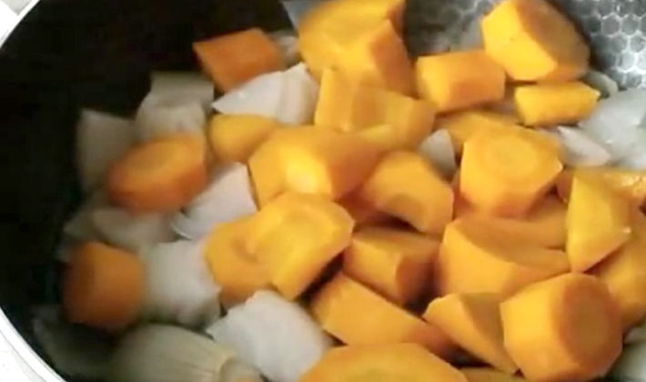 - Faites frire les oignons et les carottes hachés dans ½ partie d'huile végétale jusqu'à ce qu'ils soient cuits, puis faites-les passer dans un hachoir à viande.