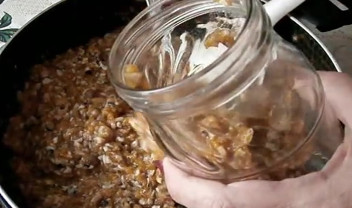 - Les oignons frits sont également passés dans un hachoir à viande et envoyés aux corps de fruits dans un plat à ragoût.