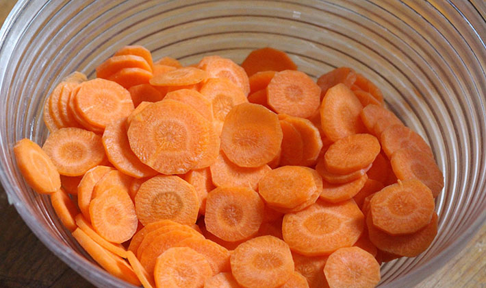 Laver les carottes et les couper en rondelles, puis cuire à moitié dans de l'eau salée.