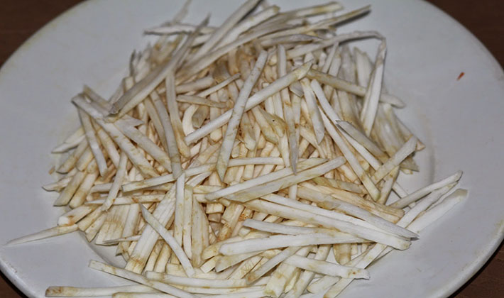 Broyer les légumes verts lavés, couper le céleri-rave en lanières.