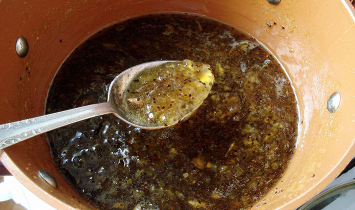 Dans l'huile restante après la cuisson des champignons, ajoutez le vinaigre et le sel, portez le tout à ébullition, puis laissez refroidir légèrement et versez dans des bocaux.
