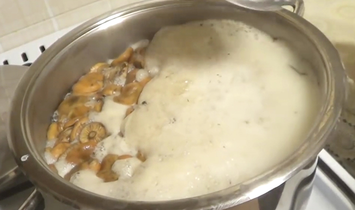 - Verser les champignons nettoyés et lavés à l'eau froide avec de l'eau, verser le sel et, après ébullition, laisser bouillir pendant 10 minutes.