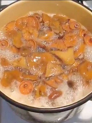- Les champignons safran pelés et lavés sont placés dans un plat émaillé, versez de l’eau de manière à recouvrir les fructifications.