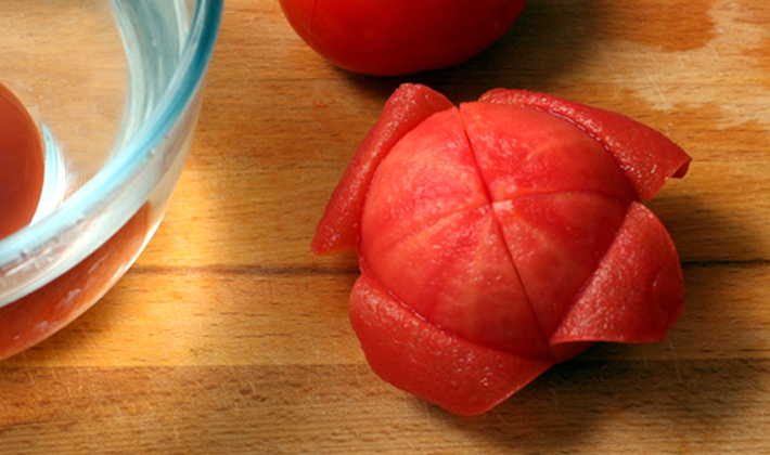 Lavez et plongez les tomates pendant 2-3 minutes dans de l'eau bouillante, transférez-les immédiatement au froid, retirez la peau et coupez-les en petits morceaux.